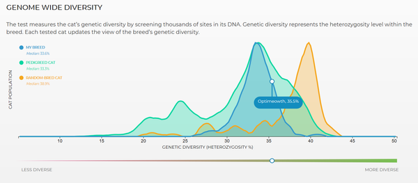While genetic diversity is the safest breeding choice for people working with unknowns, it is not the only safe, healthy choice. Linebreeding on cats with a known health history is another way to breed a healthy cat. Linebreeding can have positive and negative effects. Breeding a cat back to a close relative will magnify both good and bad traits in the line. It is essential to know the status of any genetic weaknesses in the line, as these are more likely to manifest with close breeding. Thus, if a breeder has kept, bred, and health-tested cats to older ages, that breeder has more knowledge of that cat's health than the breeder who retires cats under age five. Purposefully linebreeding on a cat whose health, including but not limited to heart health, was tested for 7-10 years means you are doubling up the genetics of a cat who has proven itself healthy and not to produce genetic flaws. Remember that we can now test the genetic diversity of those offspring so the most genetically diverse offspring could be selected for further breeding.