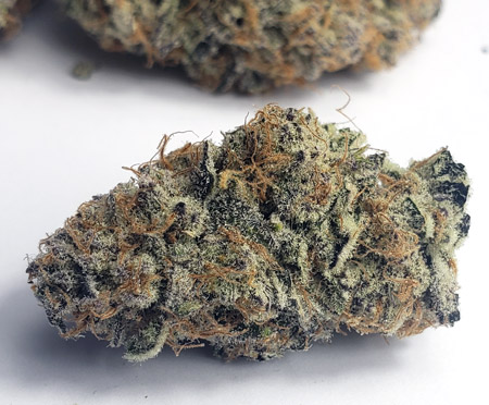 This example shows a normal bud where sugar leaves remained green at harvest. No yellow spots.