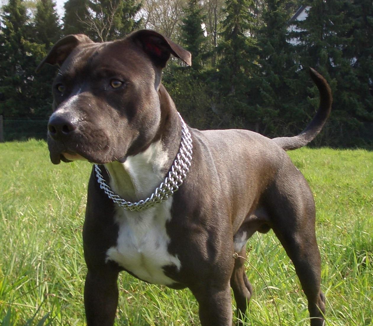 The American Staffordshire Terrier is one of the most muscular and energetic pit bull breeds. It has a wide, powerful frame, short hair and carries most of the weight in the torso. It is an intelligent and outgoing dog that usually requires a high level of activity. It is obedient and easy to train.