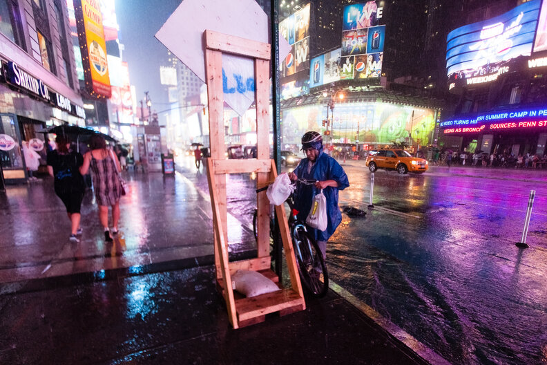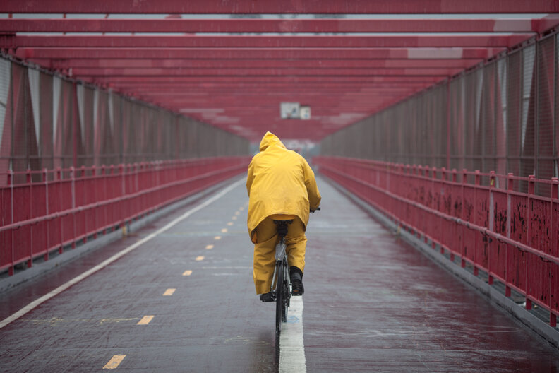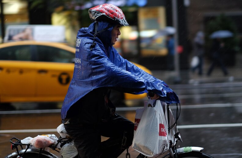 According to a delivery guy for Bobwhite Counter in Manhattan, once somebody hits "confirm" on a Seamless order, rain can make it impossible to see what's ahead of you, which isn't great when you're avoiding drivers whose only interest is getting home before the traffic gets worse. And even with a raincoat, you come to grips with the fact that you'll pretty much always be completely drenched by the time you reach your destination. Meanwhile, the general manager of Lombardi's Pizza -- who got his start delivering food -- said that while rain can be bad, it's actually the wind that makes things go from tricky to dangerous.