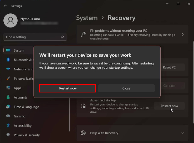 - The “We’ll restart your device so save your work” message will appear on the screen. If you’ve saved your work, press Restart now.