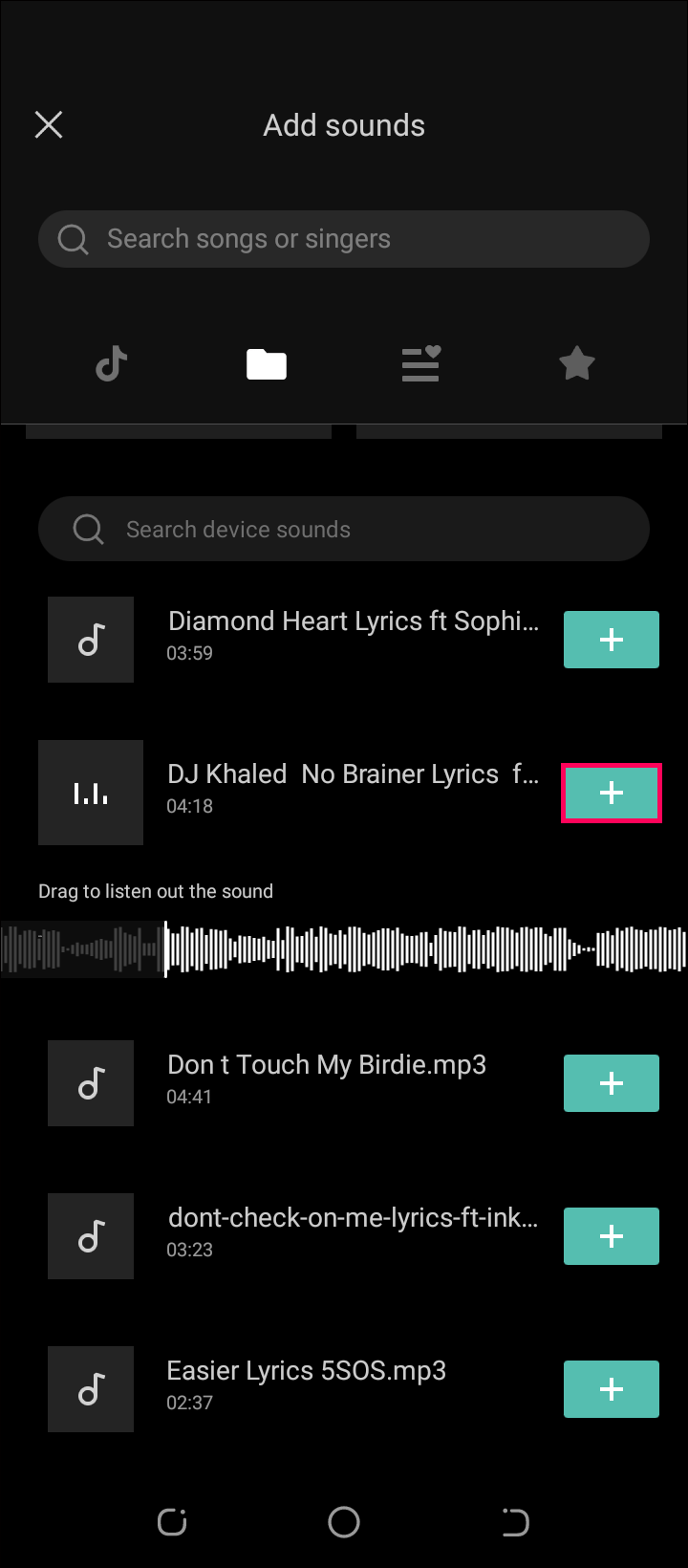 - Once the music is downloaded, you’ll find a “+” sign beside it. Tap on it to add it to the video.