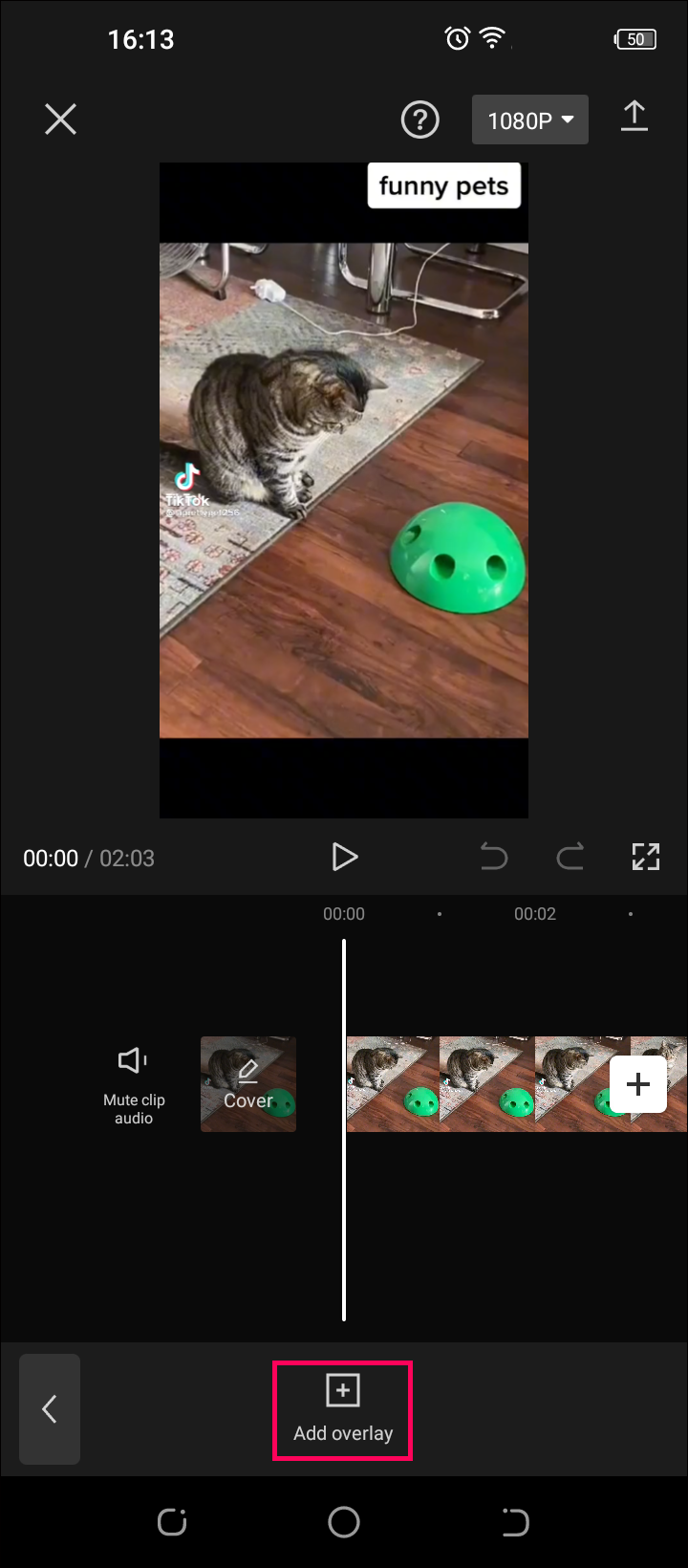 - Select the video clip you want to use as a background (you can choose multiple videos as background) and choose “Overlay’ at the bottom of the screen.