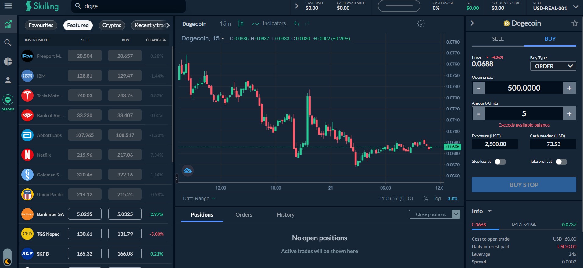 There are different trading platforms to suit different types of users. Experienced traders can access technical indicators and algorithmic trading on the cTrader platform, while those who are new to DOGE trading will find the Skilling Trader platform user-friendly and intuitive.