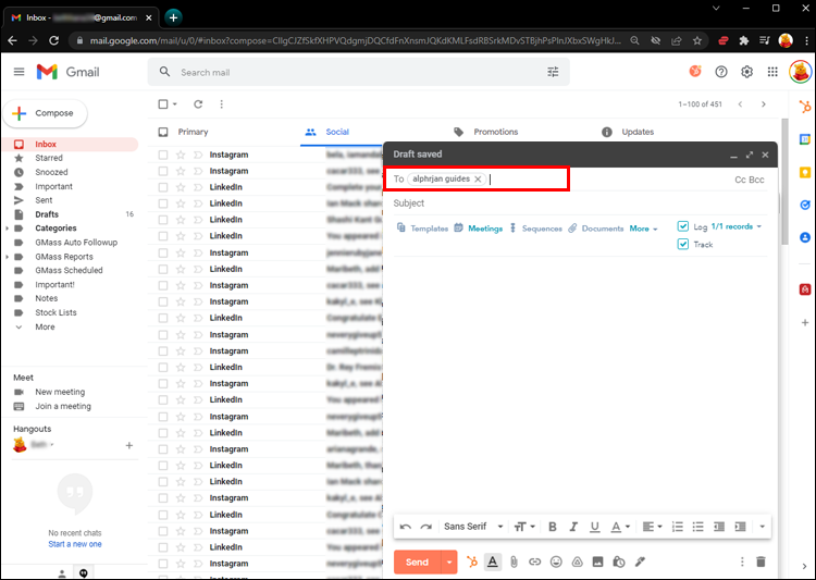 - Select the “Track” checkbox from the Gmail menu bar to enable email tracking.