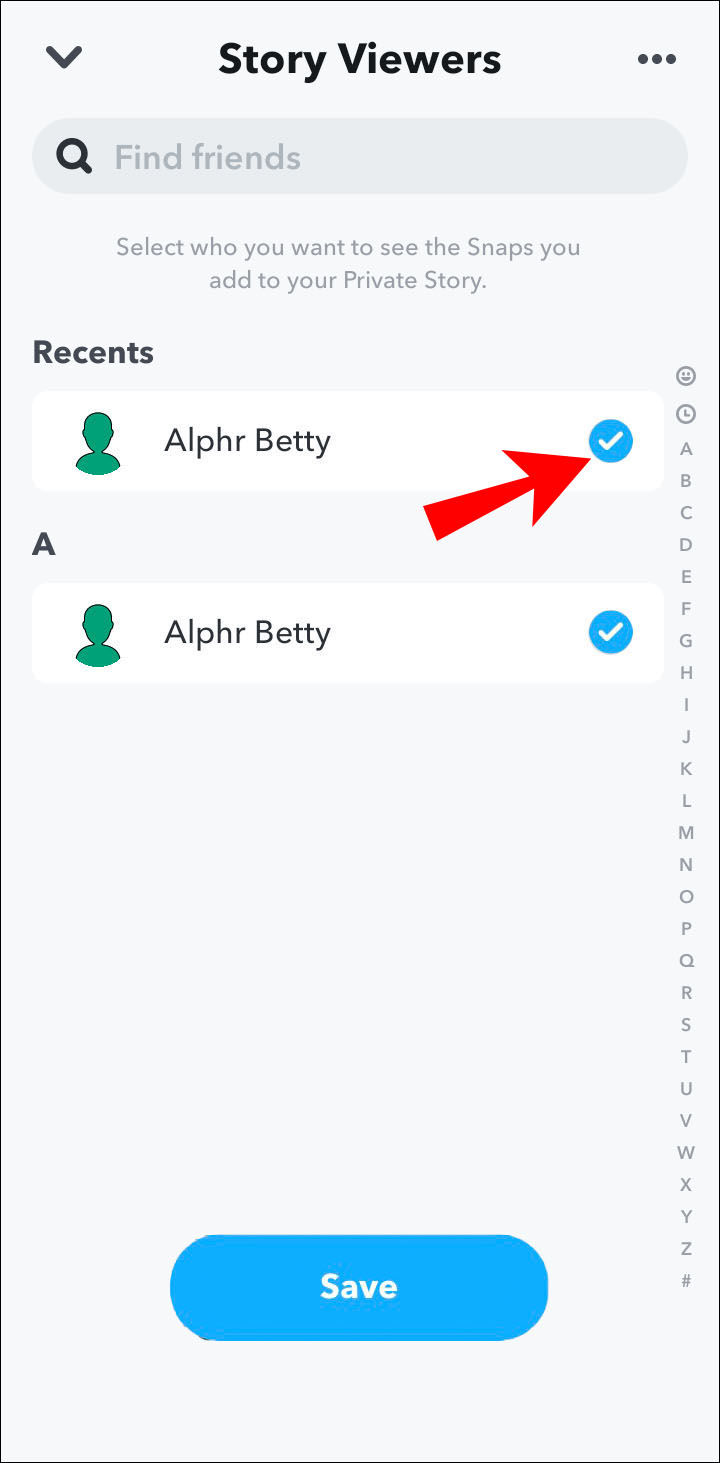 - Find the person you want to block from the private story and press the blue checkmark next to them.