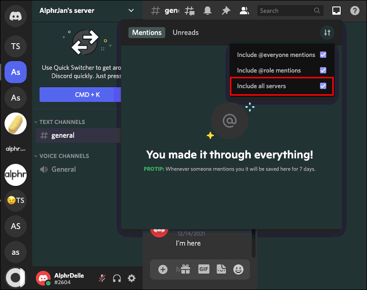 In “Recent Mentions,” you can view your pings within the last seven days either from the server you’re currently on, or all servers. You’ll then be able to drill down further to view pings sent with @everyone or @role mentions. Clicking on any message will take you to the server where the ping originated.