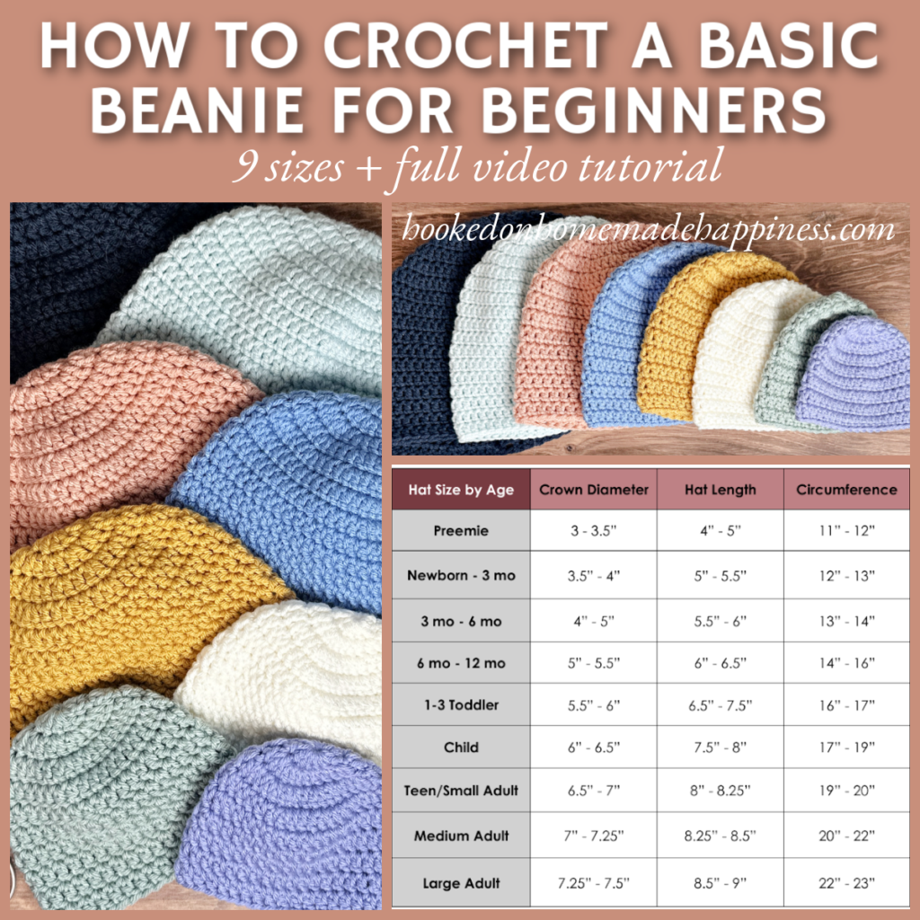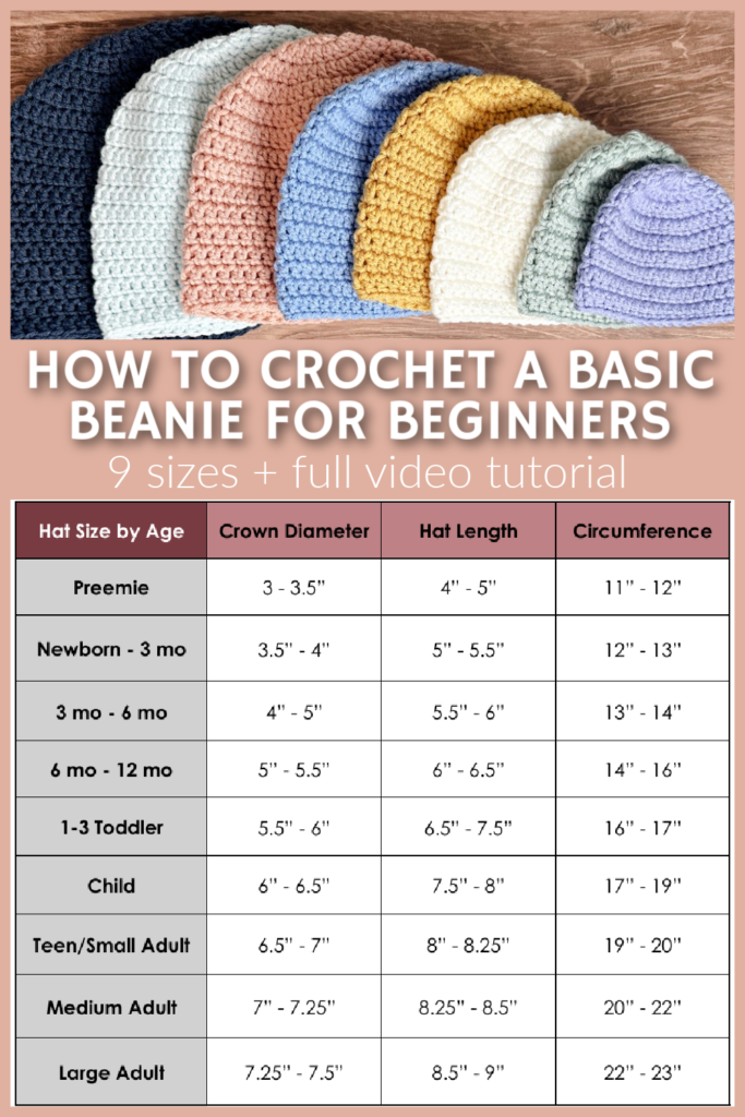 Ready to crochet your very first hat? This Basic Beanie Crochet Pattern is perfect for beginners! In the video tutorial below, How to Crochet a Basic Beanie for Beginners, I will show you how to start a beanie with a magic circle, how to crochet in the round, and how to measure a beanie for different sizes. With simple stitches and a classic shape, it’s an easy and satisfying project to get you started. The pattern includes sizes from preemie all the way to large adult, so you can make a cozy beanie for everyone in the family. A detailed size chart helps you pick the perfect fit, and there’s a full video tutorial to guide you every step of the way—even if you’re brand new to crochet. Let’s make your first beanie together!
