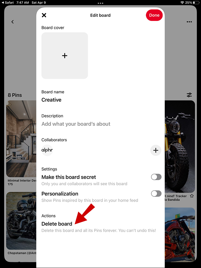 If you find the app more convenient, here’s how to delete a Pinterest board there: