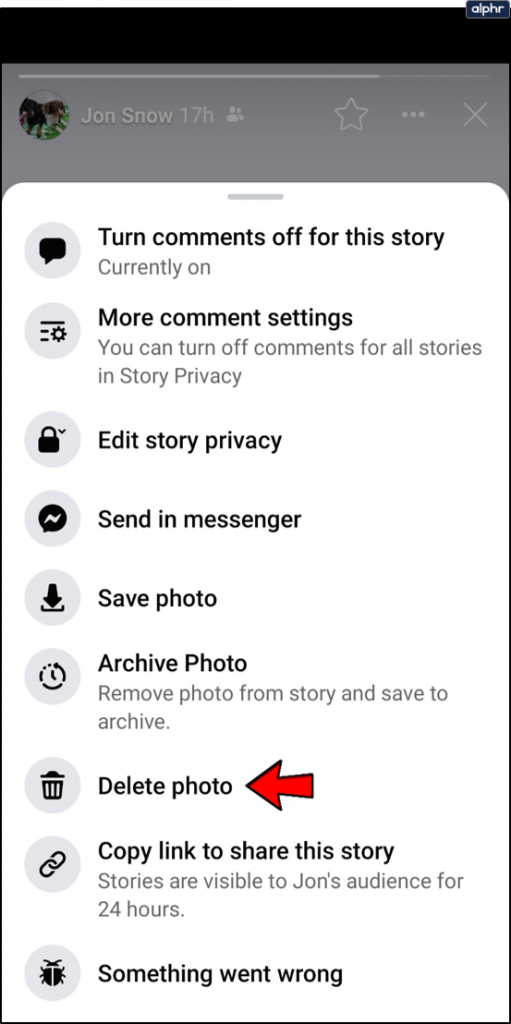 This action reveals a More menu and you need to choose “Delete photo” to remove the Story from the Feed. If you’ve used a video, the option will say “Delete video.”