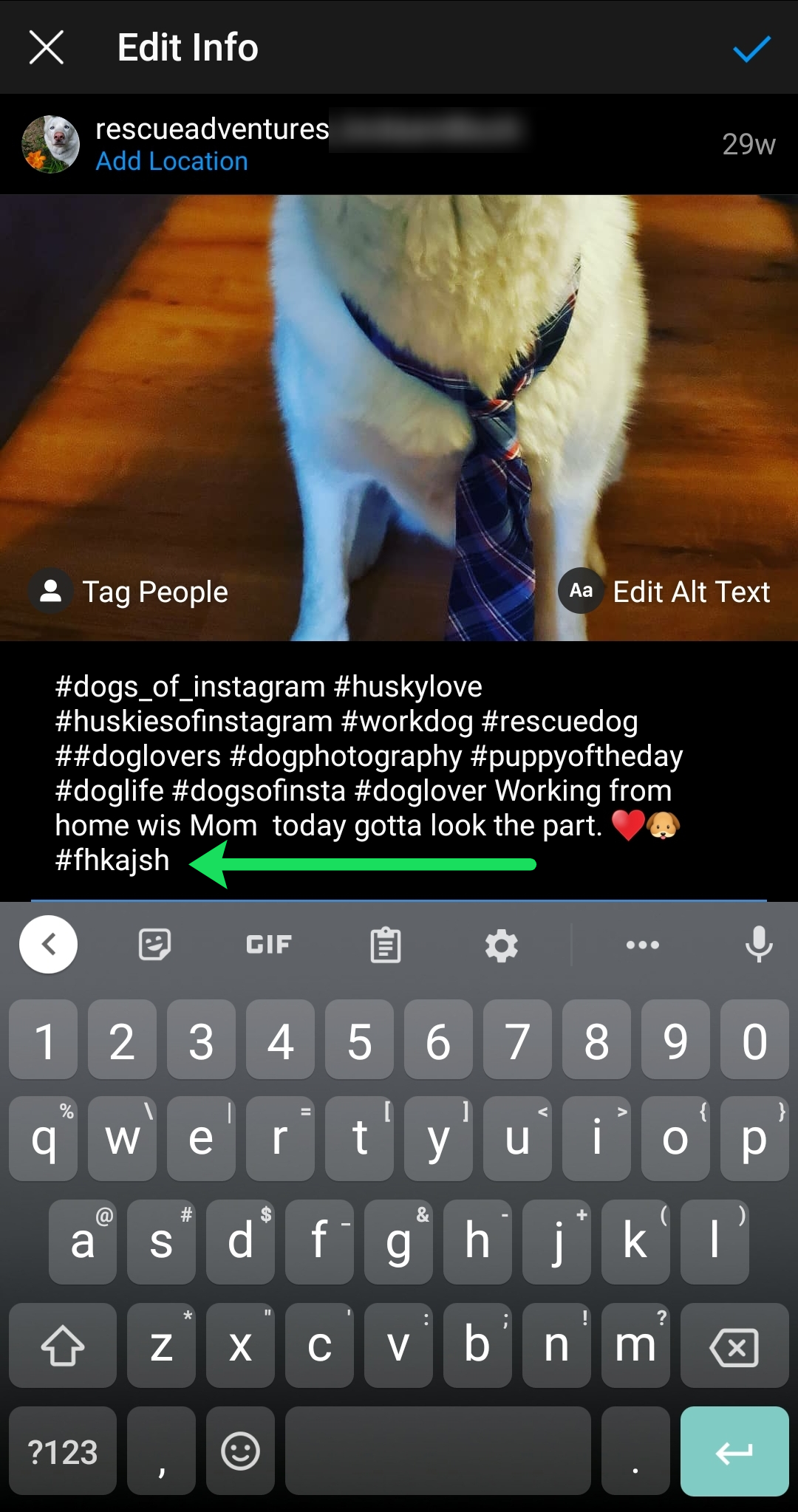 - Make up a hashtag that you know no one will use, as seen in the image below. Tap the Checkmark once you’ve added it to your post. Do this for each picture you’ve posted.