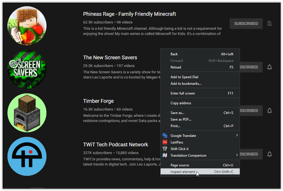 - Scroll down to the “bottom” of your subscriptions or find an empty spot on the page. Right-click the empty area (shows cursor, not hand) and select the “Inspect Element” or “Inspect” option.