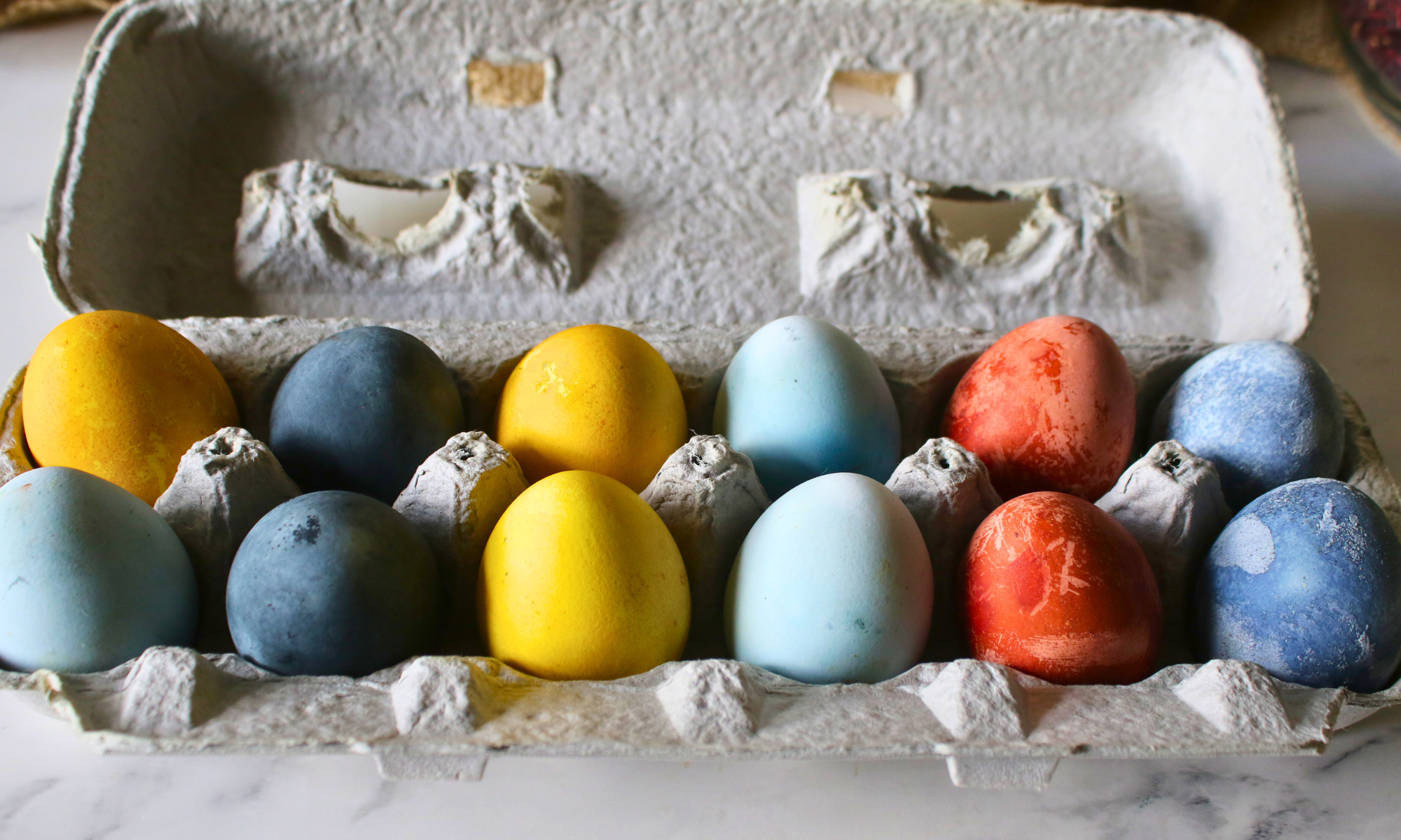 You can create beautiful earth-toned easter eggs with various fruits, vegetables, and spices. For example, red cabbage (or purple cabbage) created the loveliest blue-colored eggs, beets turned our eggs red-purple color, turmeric made our eggs bright yellow, yellow onion skins or red onion skins made gorgeous orange caramel-brown eggs, and hibiscus tea left the eggs a dark charcoal-purple color.
