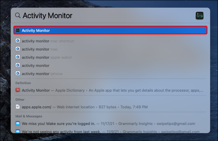 - Enter a search for “Activity Monitor” and open it.