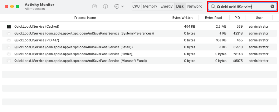 - Select the “Disk” tab from the options at the top, then find the “QuickLookUIService” process name. Or you can enter a quick search for it from the top right corner.