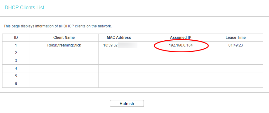 - Locate the Roku device on this page. It should be listed by its hostname.