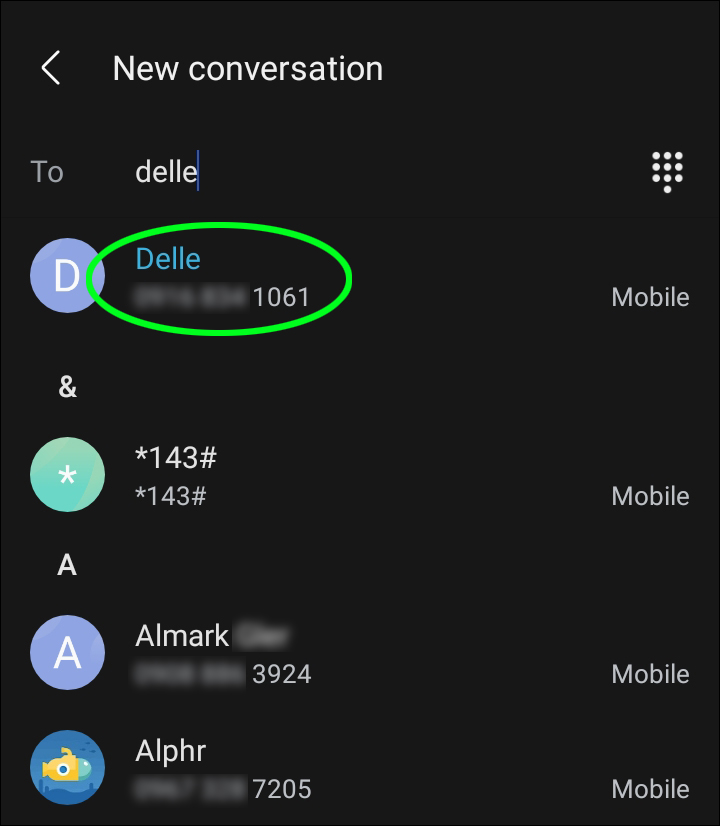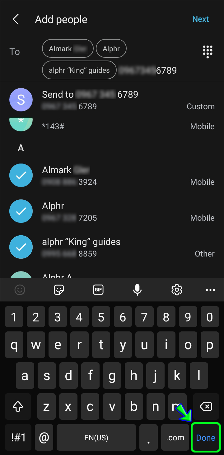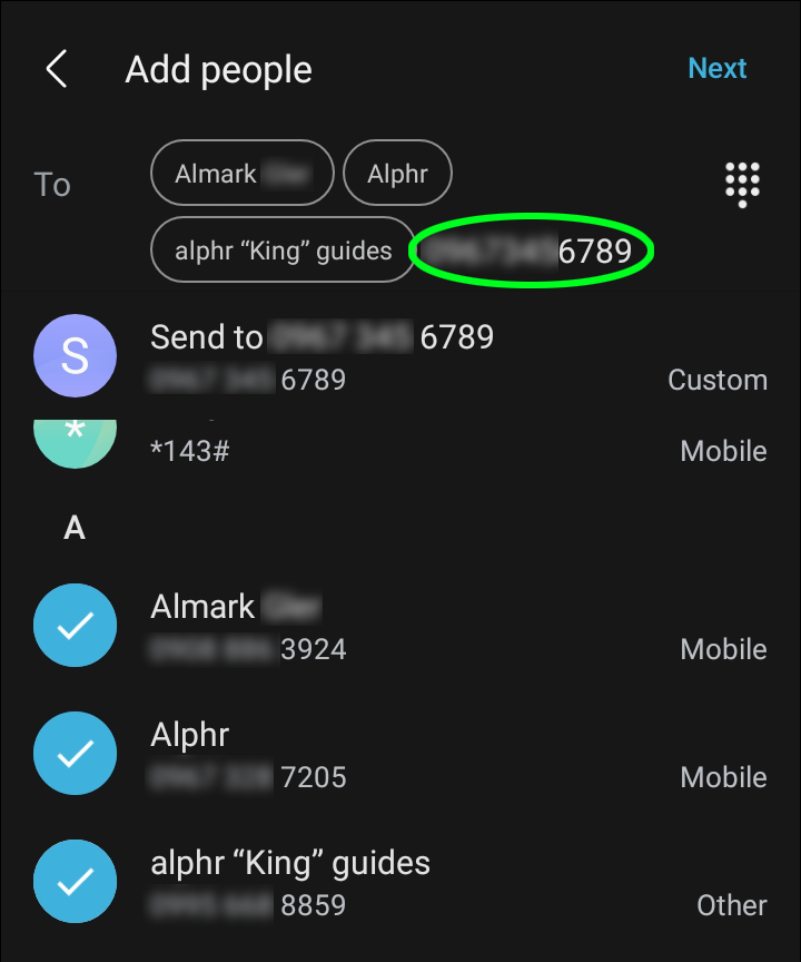 - Find the recipients’ names and select them one by one. You can also enter the phone numbers in the bubble at the top of the screen. Press the minus icon next to the name if you accidentally added a recipient.