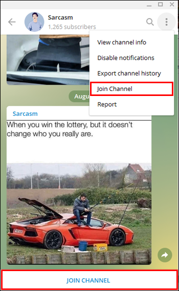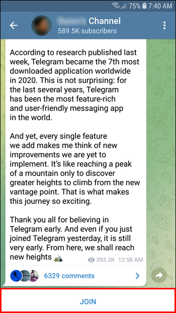 - The Telegram app will launch automatically, and the channel will open. Tap Join.