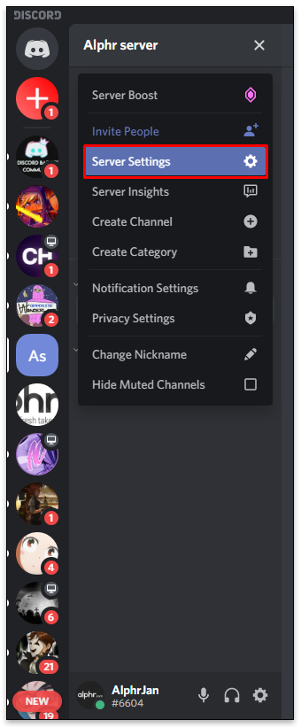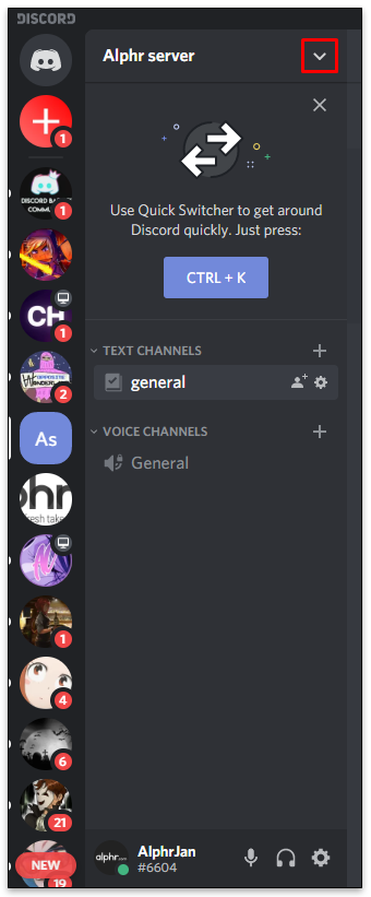 - Head over to the top-left of the screen and click on the down-arrow next to your server’s name.