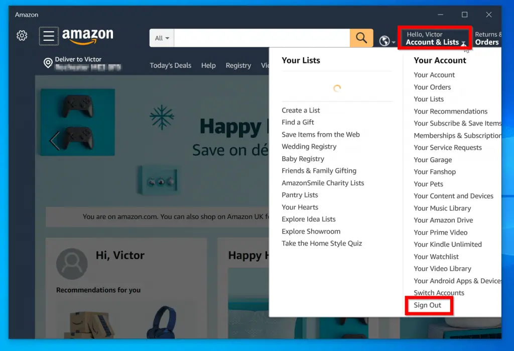 - Then on the top right of the App, hover over Accounts & Lists. Finally, from the list of options click Sign out.
