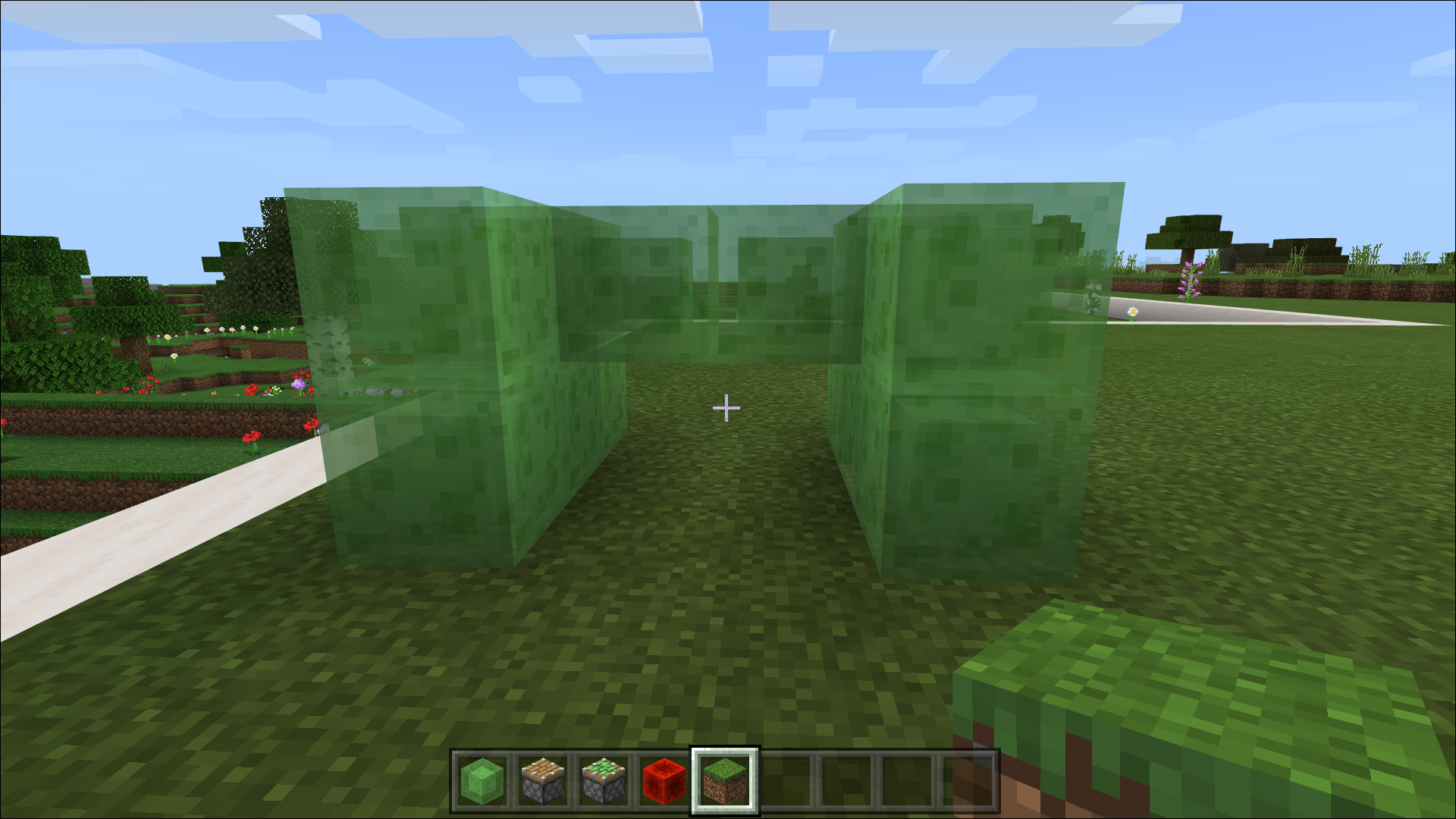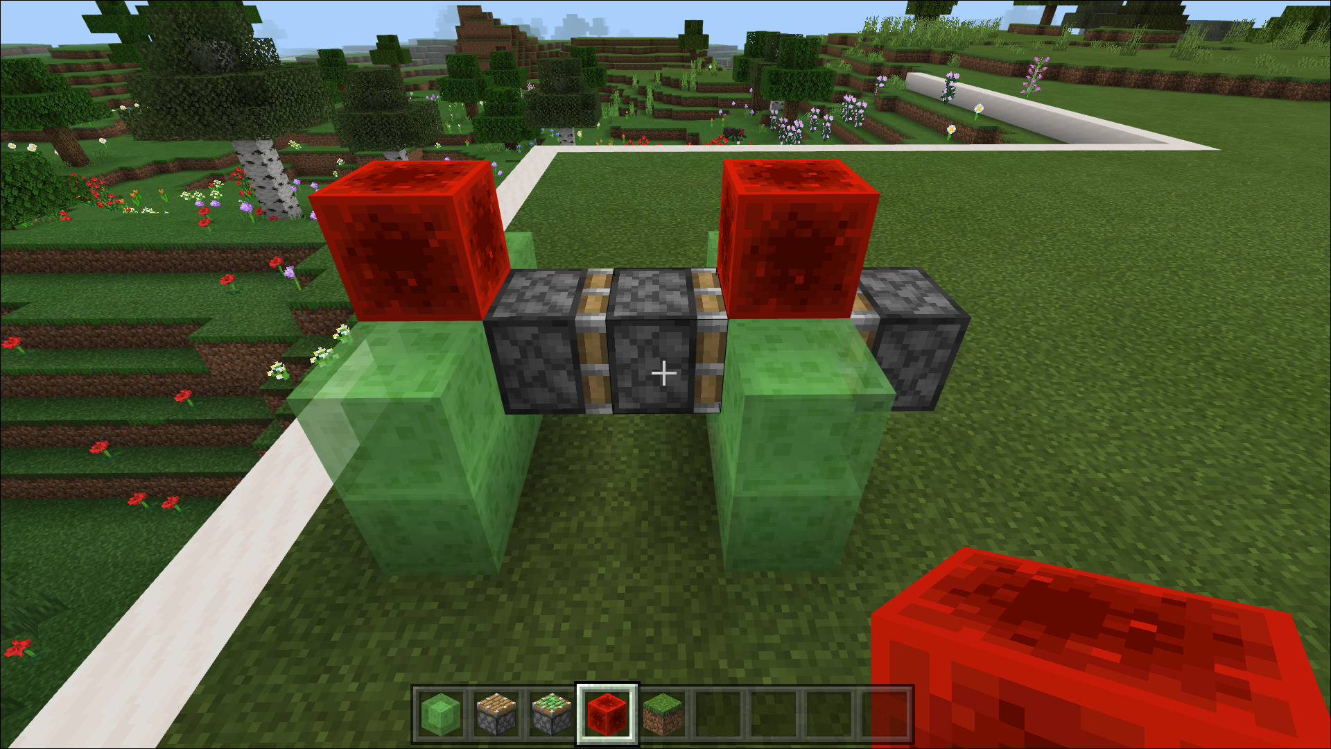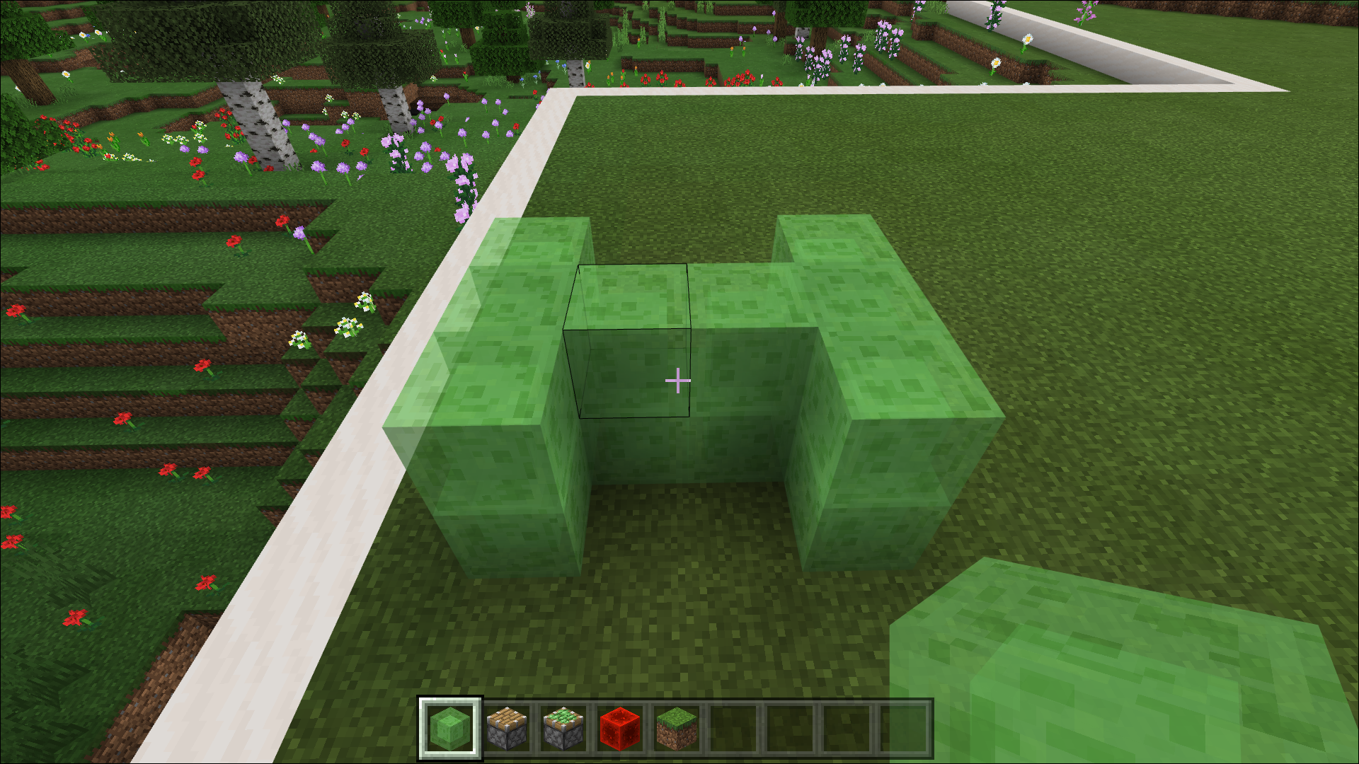 - From Slime Blocks, create two parallel rows from three blocks each, with two more blocks connecting them in the center. Your construction must look like a wide letter “H.”