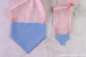 - Put the 2 tie pieces with right sides together and sew the straight ends with a ½ inch (12mm) seam allowance. Press open the seam.