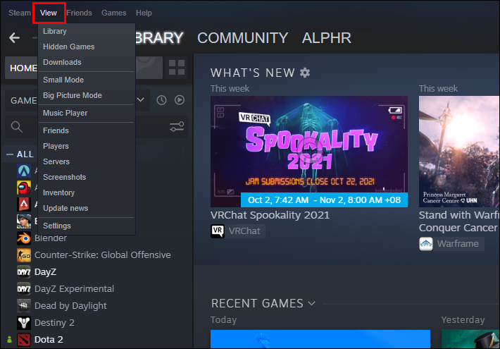 - Open Steam and press the “View” button in the upper-left section of the display.