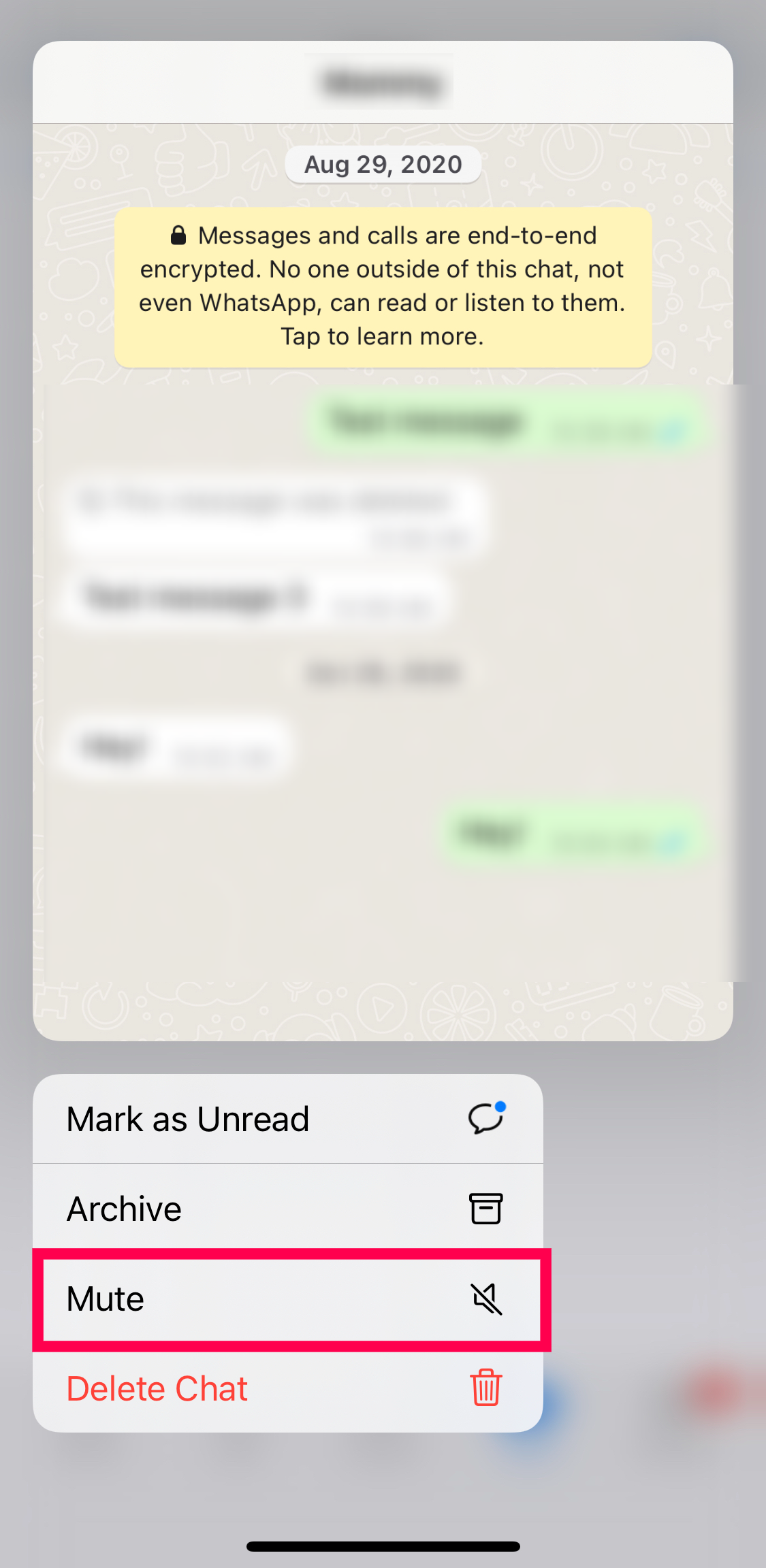 - iOS users can long-press the chat and tap Mute in the pop-up window.