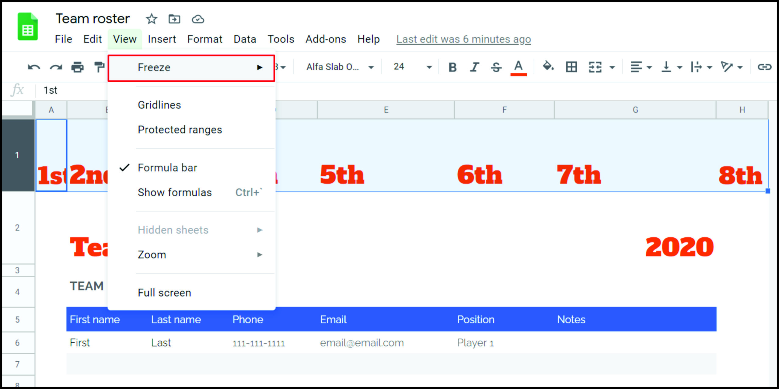 - When the “Freeze” menu opens, select “1 row.”