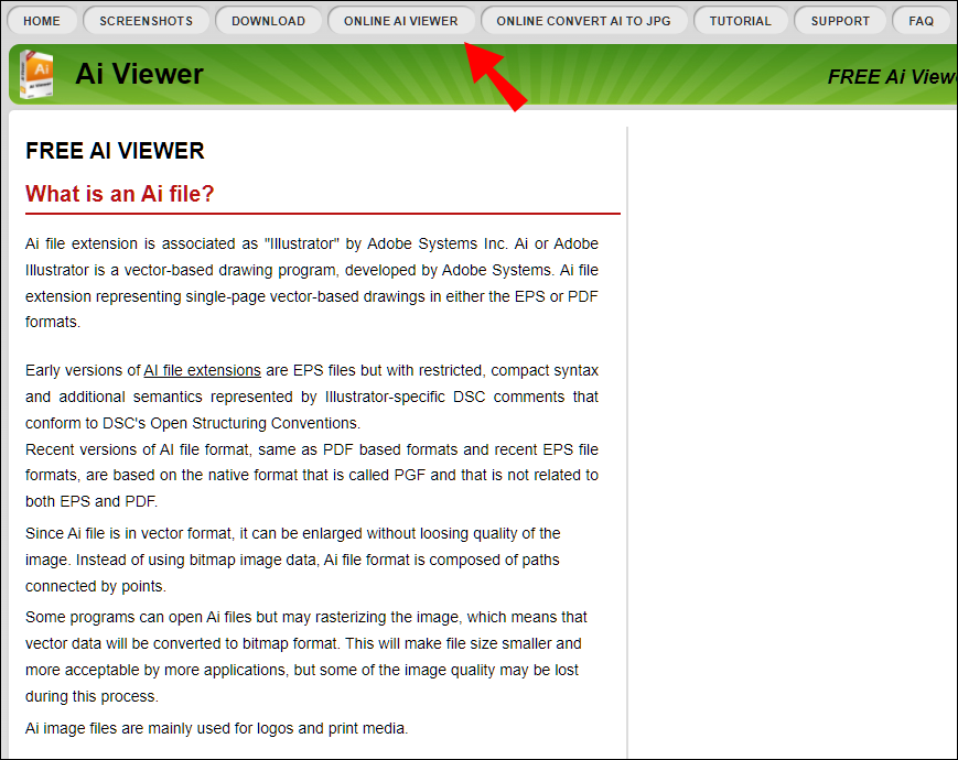- Open the AI Viewer website. If you’re on the home page, click on the “Online AI Viewer” button at the top of the screen.
