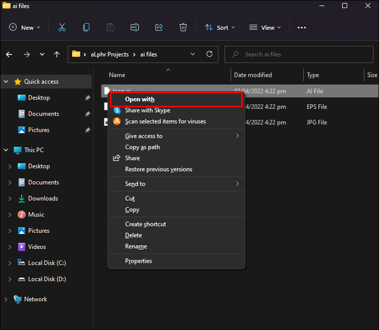 - Open a folder containing any .ai file and right-click on it.