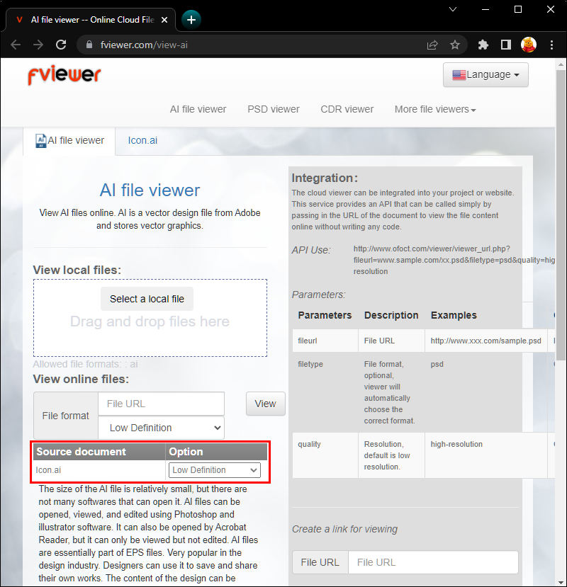 FViewer is a simple online AI file viewer. There is little else in the way of editing options, though you can view these files in high-definition mode. With no listed file size limit, FViewer may be the best choice for larger files. To use FViewer, you’ll need to: