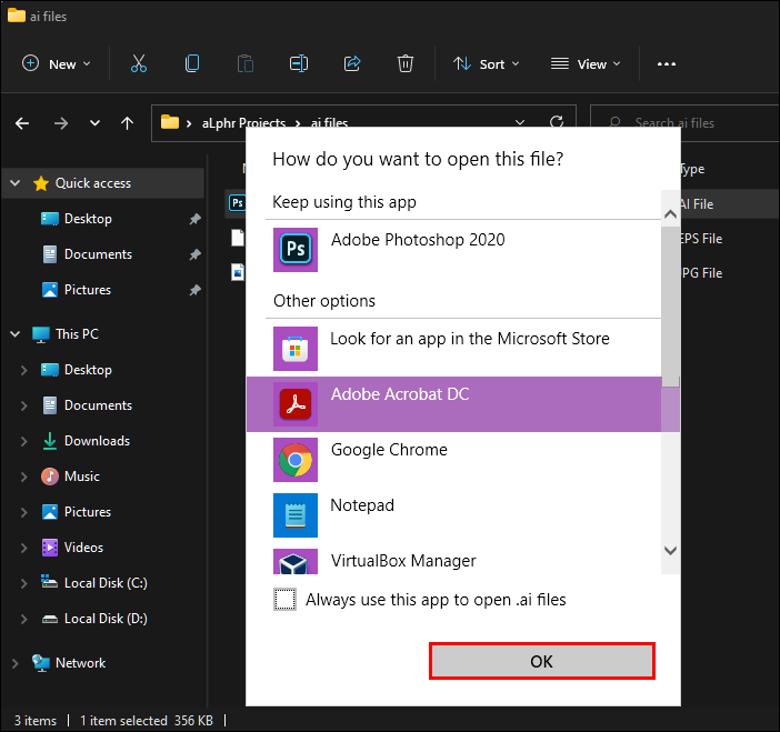 It’s important to remember that if you change the program associated with .ai files, you’ll need to change this back if you decide to install Adobe Illustrator. If you don’t, Adobe Illustrator won’t automatically open .ai files by default.