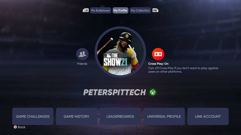 To enable crossplay, go back to the "My Profile" section of the profile menu (found in the top left corner of the main menu.) Highlight the crossplay button directly to the right of your profile picture and select it to turn it on. Now you should be able to play games with MLB The Show profiles registered on other systems.