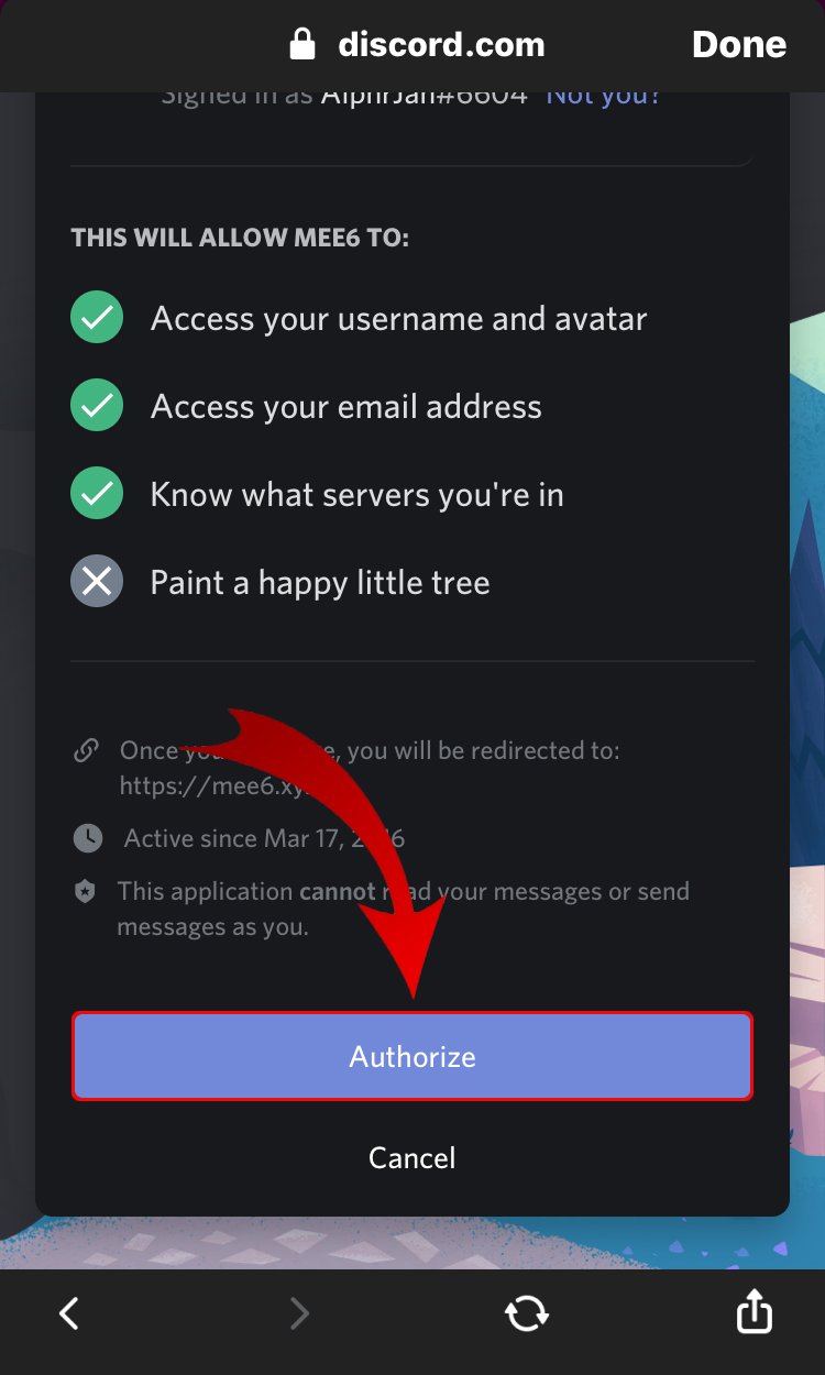 - Tap “Authorize” and the “I’m not a robot” box, which installs the bot to your Discord server.