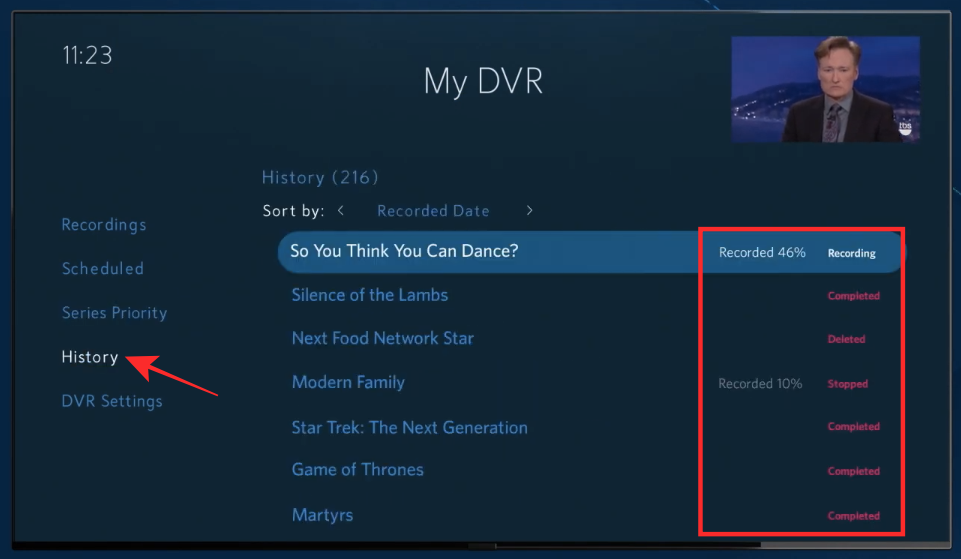 Now, go to the ‘History’ tab from the left sidebar inside the ‘My DVR’ screen and you will see a list of all the programs that you set for recording.