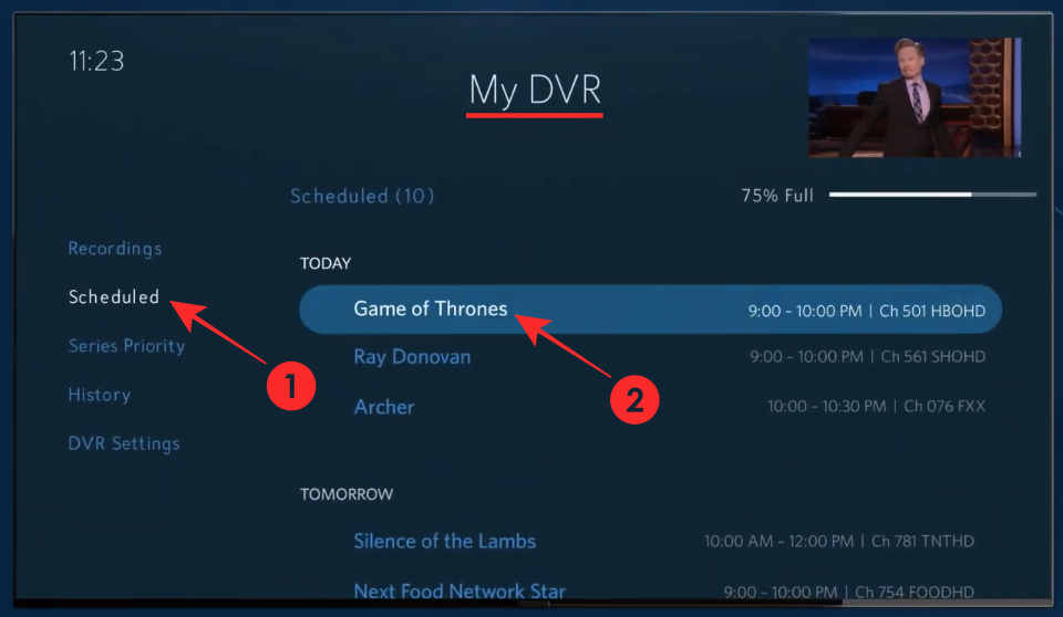 Inside the ‘My DVR’ screen, select the ‘Scheduled’ tab on the left sidebar.