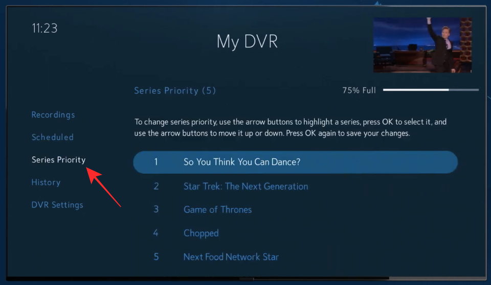 Inside the ‘My DVR’ screen, select the ‘Series Priority’ tab from the left sidebar. You will be presented with the list of ranking that is set for your recordings.