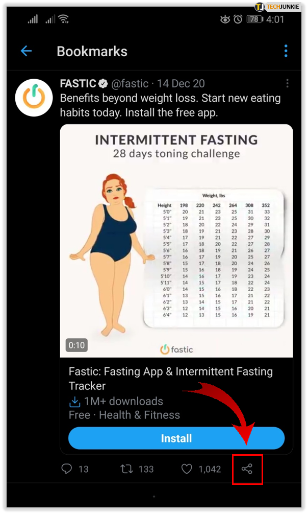 - Tap the share button below the tweet you want to bookmark. It is located to the right from the comment, like, and retweet buttons.