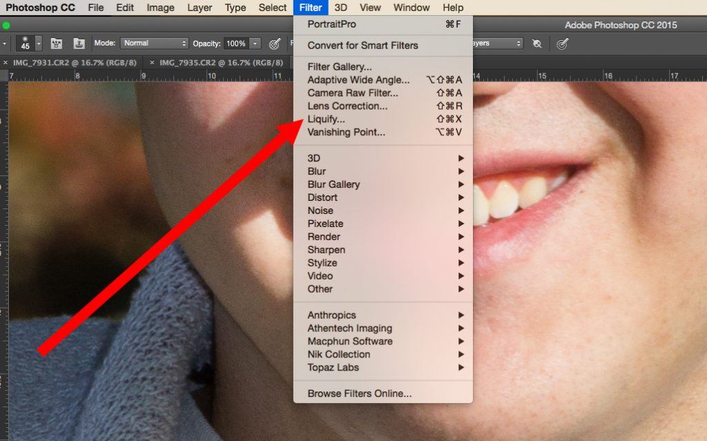 With the image opened up in our “Workspace” in Photoshop, we go to the “Filter Menu” and select the “Liquify” filter.