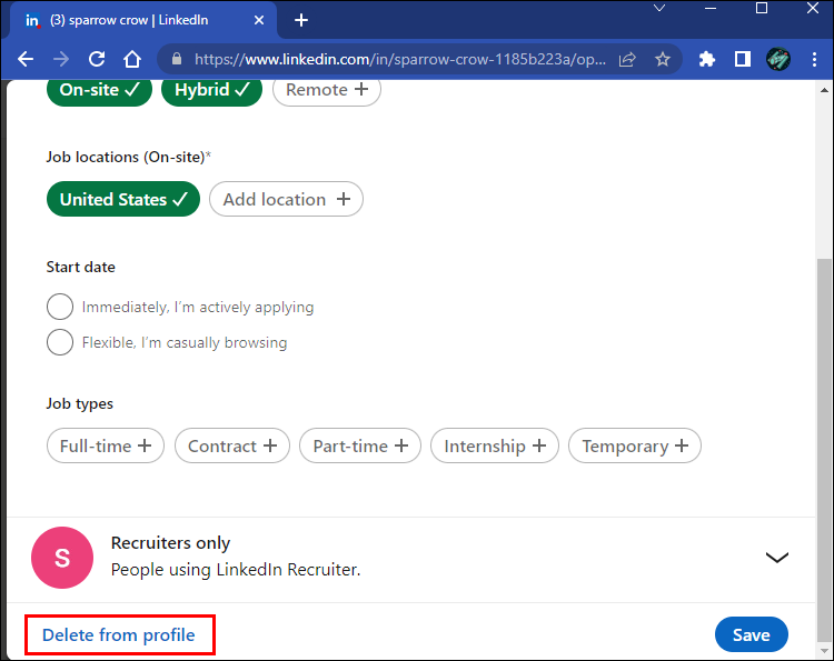 - Hit “Delete” in the pop-up, and the “Open to work” status will be removed from your profile.