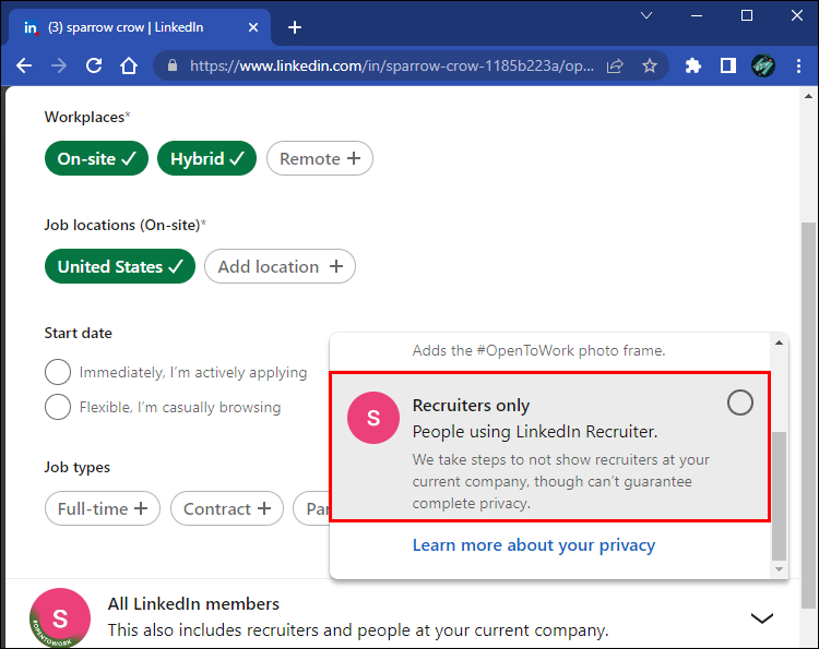 LinkedIn’s Open to Work feature makes it easier for recruiters to find interested candidates. However, your status is visible to all LinkedIn members by default. Changing the visibility to Recruiters only using the instructions above will ensure that your job-hunting status remains private.