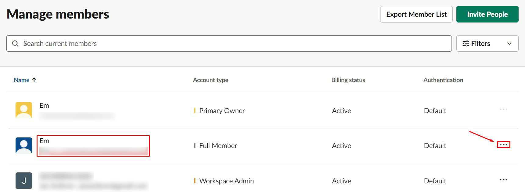 - A new window will open. Find the member whose account you want to deactivate and press the three-dots icon next to their entry.