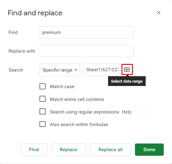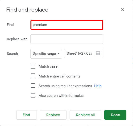 There are some additional options that are available only on the desktop versions of Google Sheets. In the “Find and Replace” menu, you can select “Match case” to make the search case sensitive. Checking the box next to “Match entire cell contents” will search for cells that are exact matches. The “Search using regular expressions” option will search for cells matching a particular pattern. Checking the box next to “Also search within formulas” will include formulas into the search.