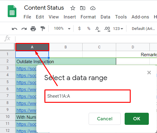 - Instead of using a formula, simply click the “Select data range” feature to the left of this box.