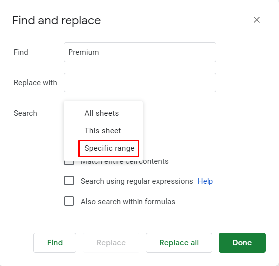 The easiest way to search a column for a particular word/phrase is to set a specific range for the search using the “Find and Replace” feature in Google Sheets. Here’s how to go about this.