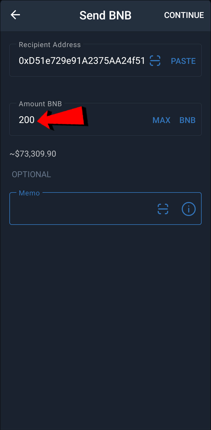 - Under BNB Wallet Address, paste the address code you copied from Metamask.