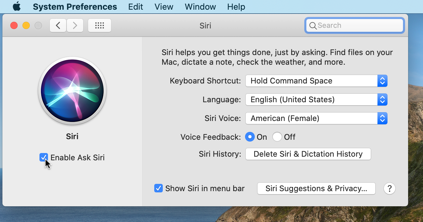 - On the left side of the window, check the box that reads “Enable Ask Siri.”