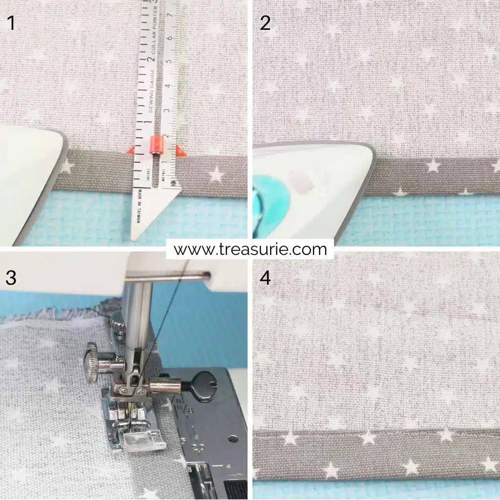 - Step 1: First, press or fold the raw edge over by the seam allowance. The most common in Treasurie sewing patterns is ½ inch (12mm) or ¾ inch (2cm).