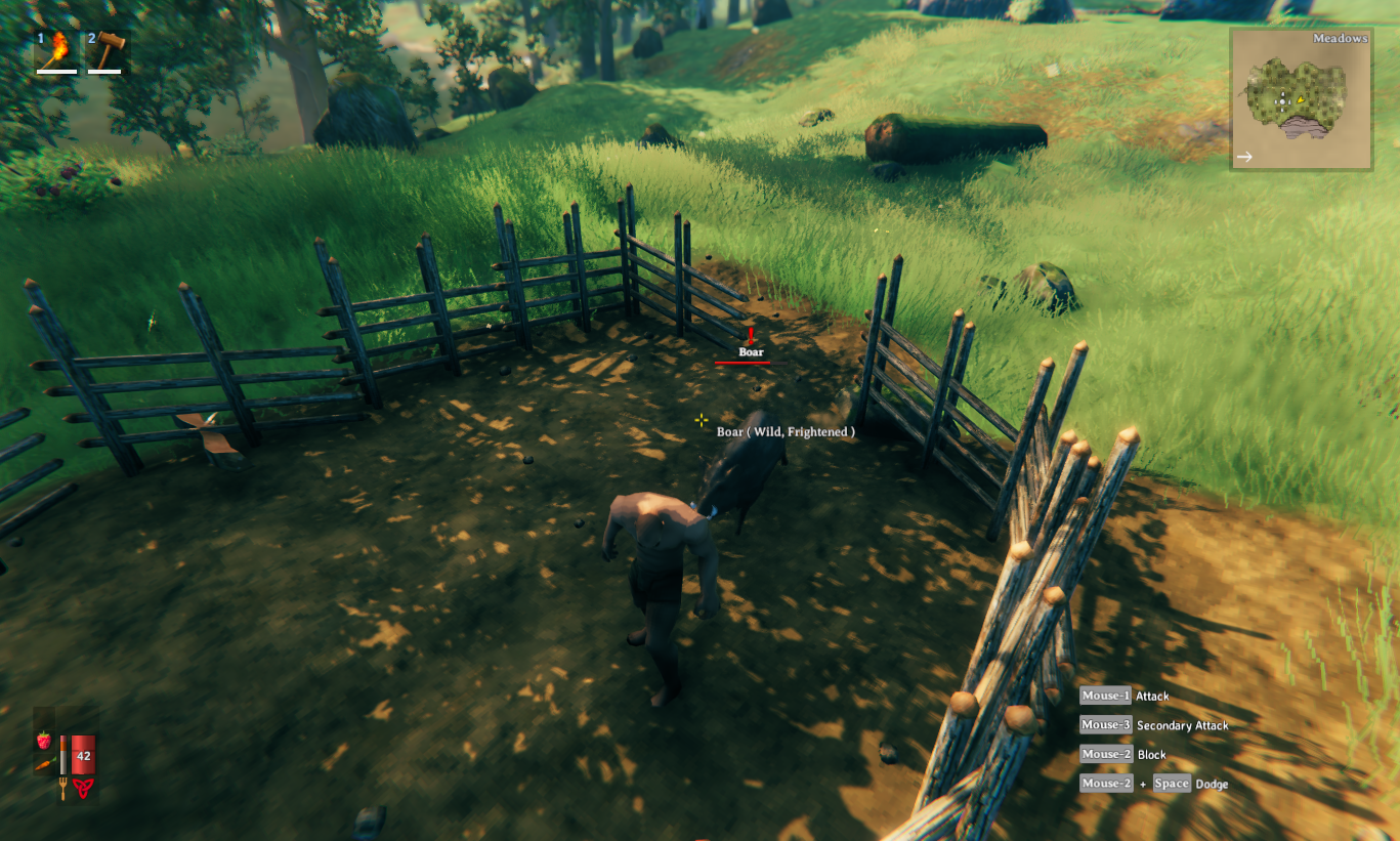 As you may imagine, building a pen around the boar (and you) is only for the bravest of Valheim warriors as these angry little piggies will try to take you down during the process. However, if you’re having problems leading a boar towards a certain direction, this may be an easier option. Just remember to make sure you can jump over the fence wall or leave an opening to exit out of once you have the boar properly penned in.